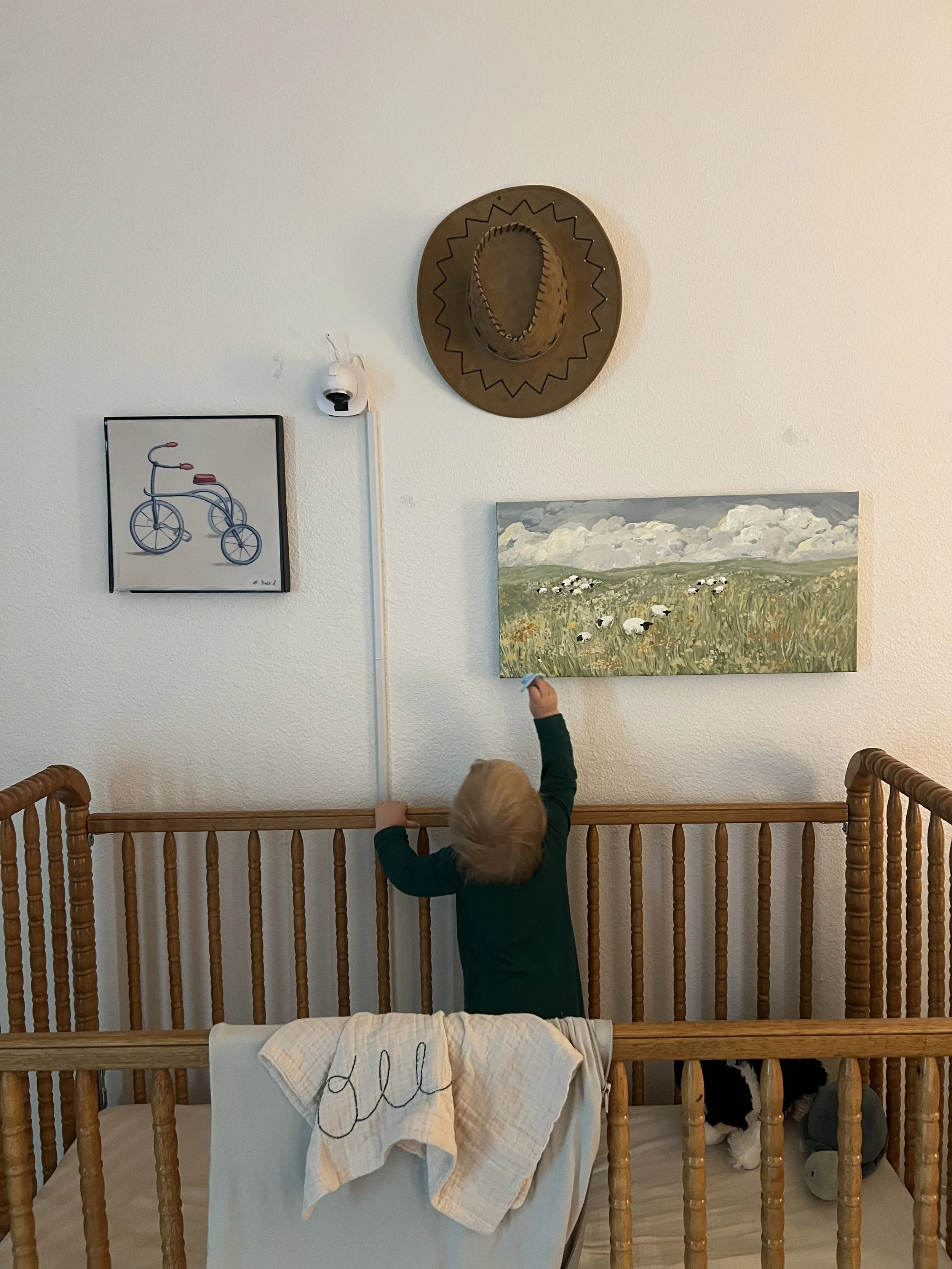 Ollie’s sheep painting hanging over his crib was the original in the sheep series! Perfect for nurseries & childhood bedrooms.